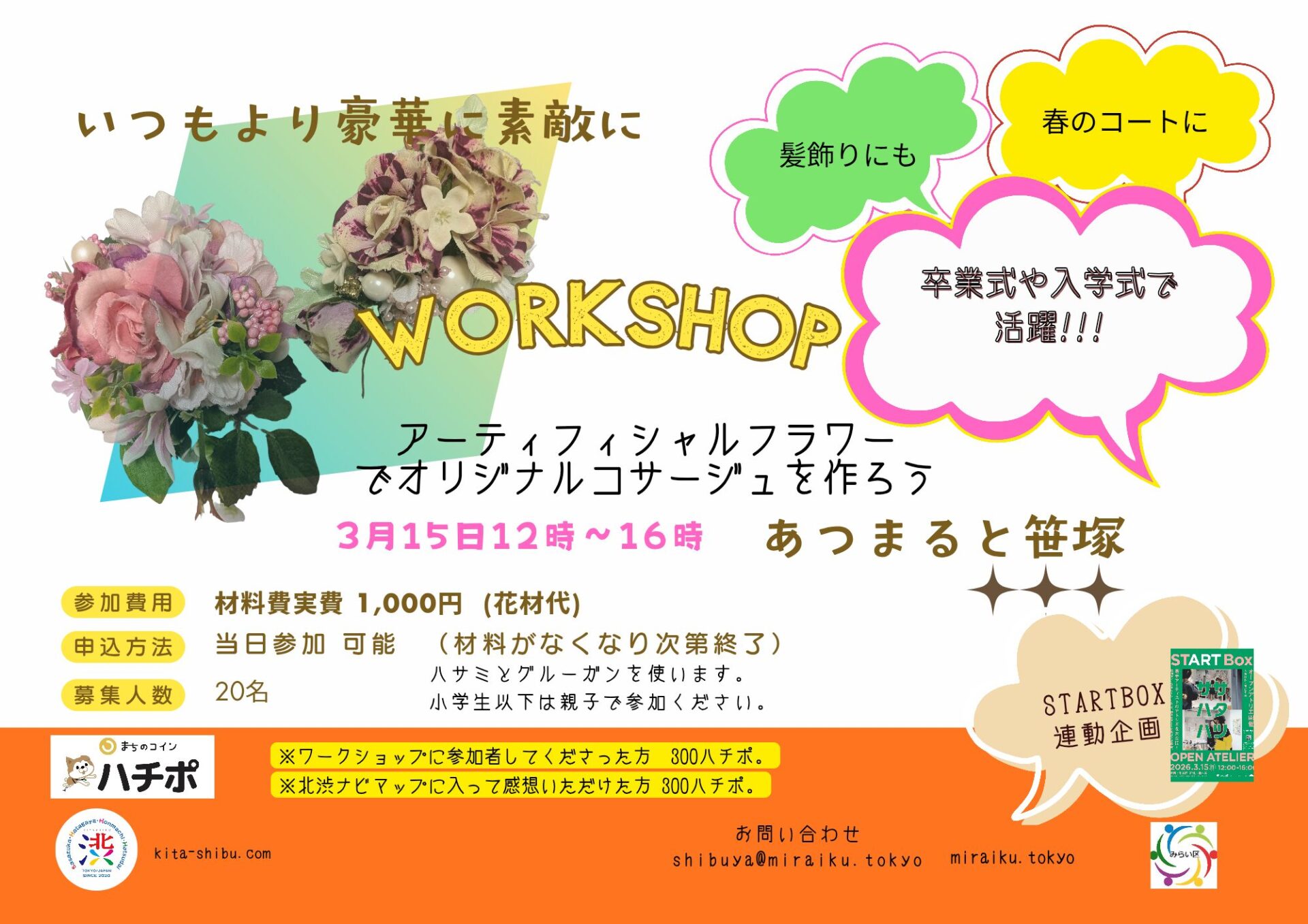 アーティフィシャルフラワーでオリジナルのコサージュ作り。 卒業式、謝恩会、入学式の大切な記念日に自分だけのコサージュを飾りませんか? お子さん向け、保護者向け、帽子やマフラーにつけても、発表会の髪飾りにも、用途は様々。 ものづくりの時間を楽しみに来てください。 日時 3月15日12時から16時まで場所 あつまると笹塚参加費 /講習費 無料材料費は実費を頂きます。 START BOX連動企画協力 北渋プロジェクト主催 みらい区 お問い合わせshibuya@miraiku.tokyoこどもテーブル みらい区東京都渋谷区笹塚2-42 都営笹塚二丁目アパート42-15号棟1階 あつまると笹塚3/15(土)12:00〜16:00shibuya@miraiku.tokyo詳細はこちら PREVみんなの交流の場「どなたでも食堂~お夕ご飯の日」NEXTみんなの食卓#31