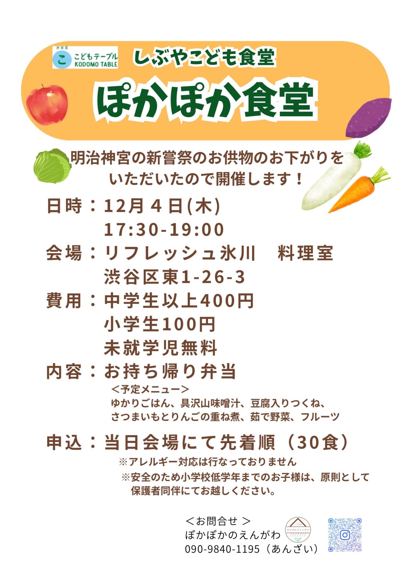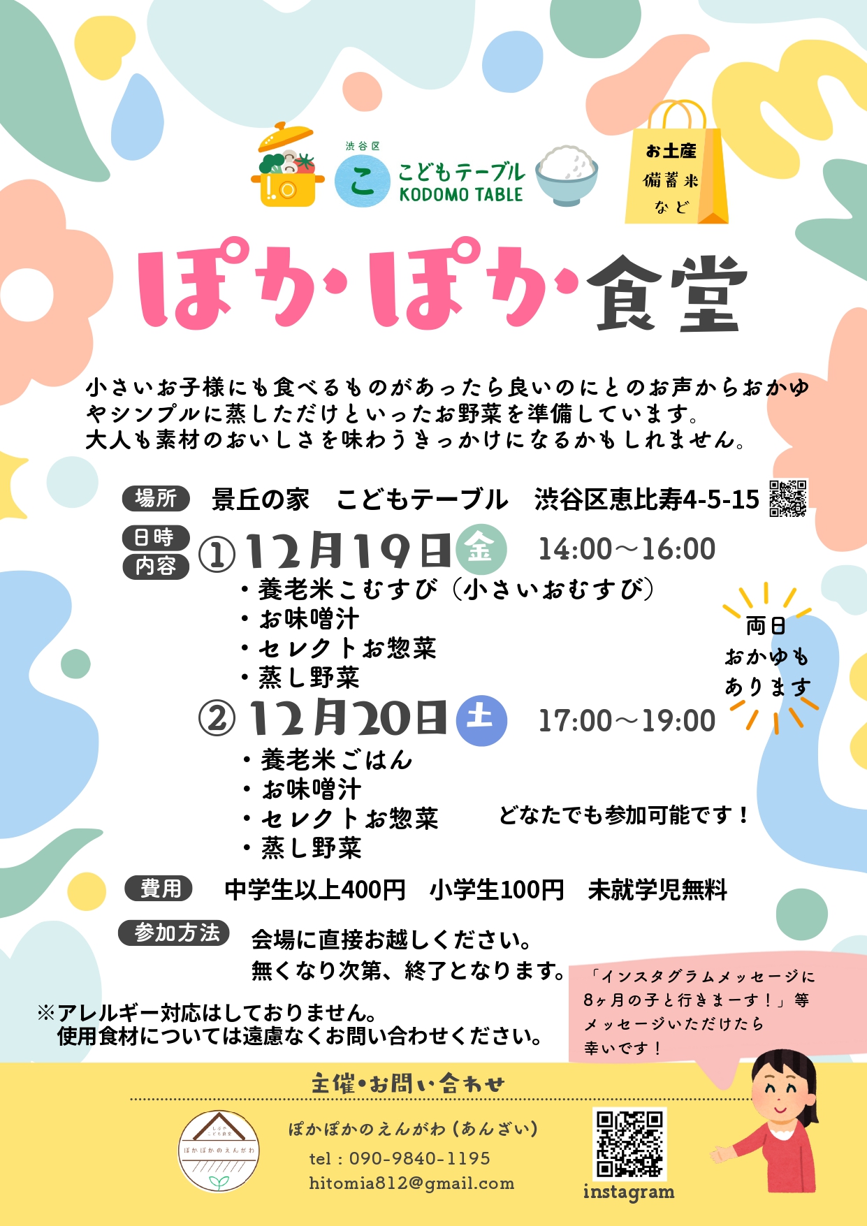 12/4(木)渋谷区東1-26-3 リフレッシュ氷川 料理室 / 12/19(金),12/20(土)渋谷区恵比寿4-5-15 景丘の家