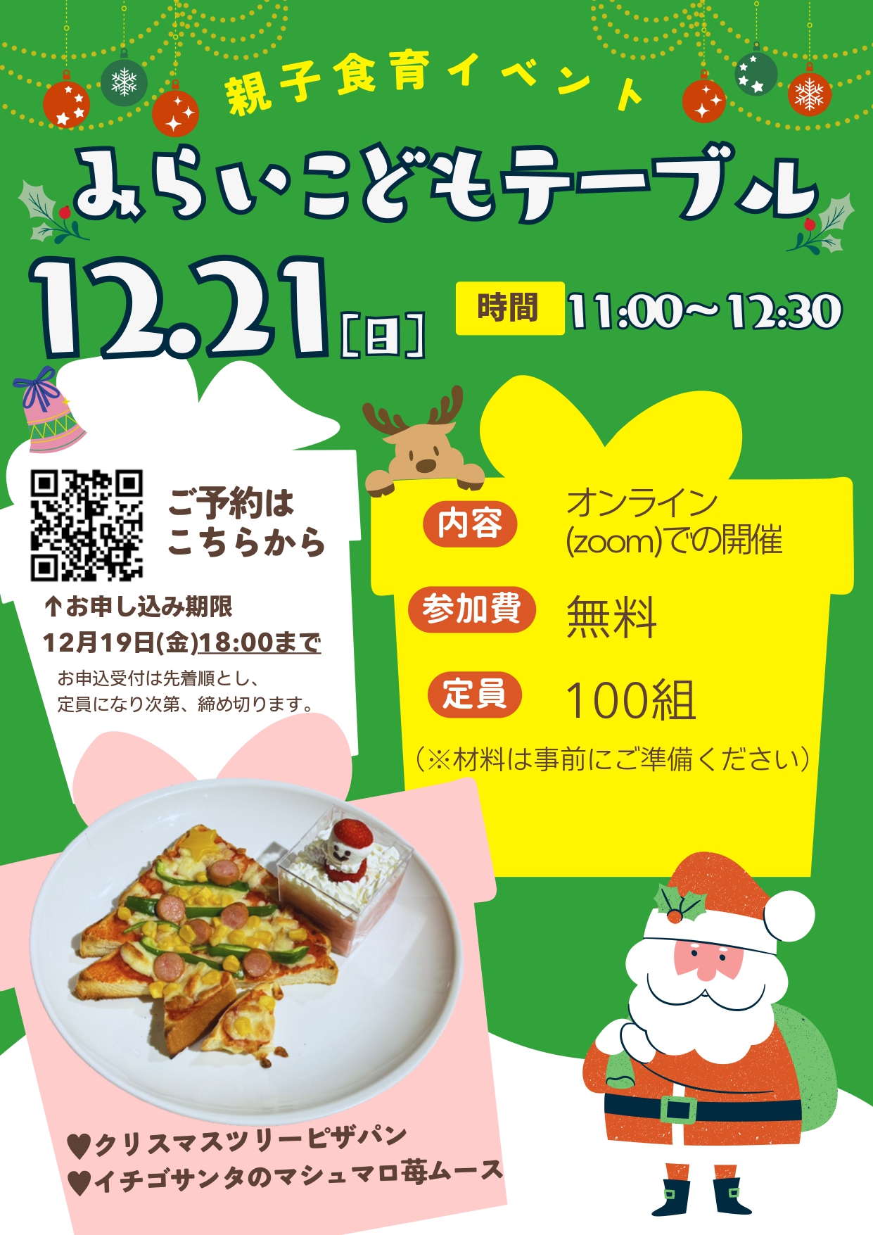 今回は形がかわいい「クリスマスツリーピザパン」とイチゴ、マシュマロを使用した「イチゴサンタのマシュマロ苺ムース」をつくります。